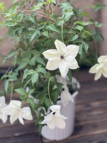 4月中旬に購入したクレマチス(テッセン) 室内に飾って、花を楽しみました♪ フロリダ大輪系 開花時期:5月~11月 花径:8~12cm 高さ:2~3m 咲き方:新旧両枝咲き 剪定:中・強剪定 数日で次々と花が咲いて 3週間後には花色が白く、真ん中の紫部分が小…